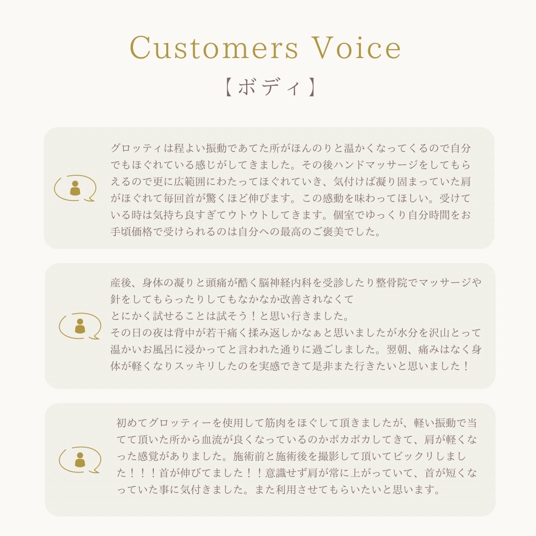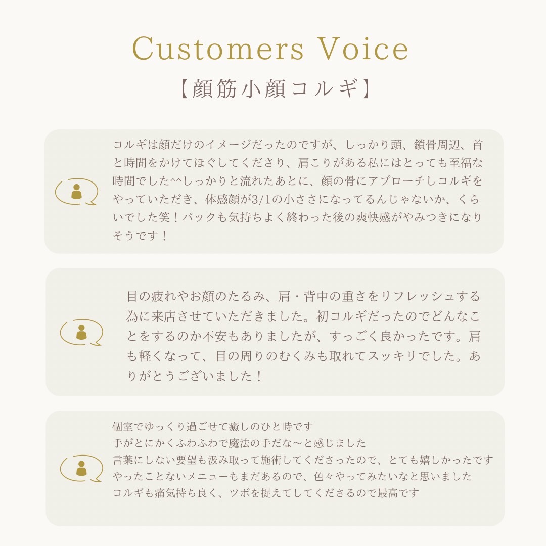 そのうえで、「顔筋小顔コルギ」ではどのサロンにも負けない自信があります。元々「肌質改善」をメインとしたサロンで、たくさんのお客様にお肌の変化を喜んで頂いた実績もあるので「顔筋小顔コルギ」と「肌質改善」にコミットします。