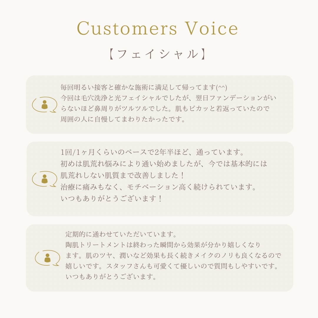 中でも「顔筋小顔コルギマッサージ」はお客様から大好評のメニューとなっており、合わせて「光フェイシャル」「陶肌トリートメント」「幹細胞導入」などの美肌メニューも「メイクのノリが良くなった」とのお声を頂くことが多く、ノーファンデーションのお客様が増え、高いリピート率を頂いております。